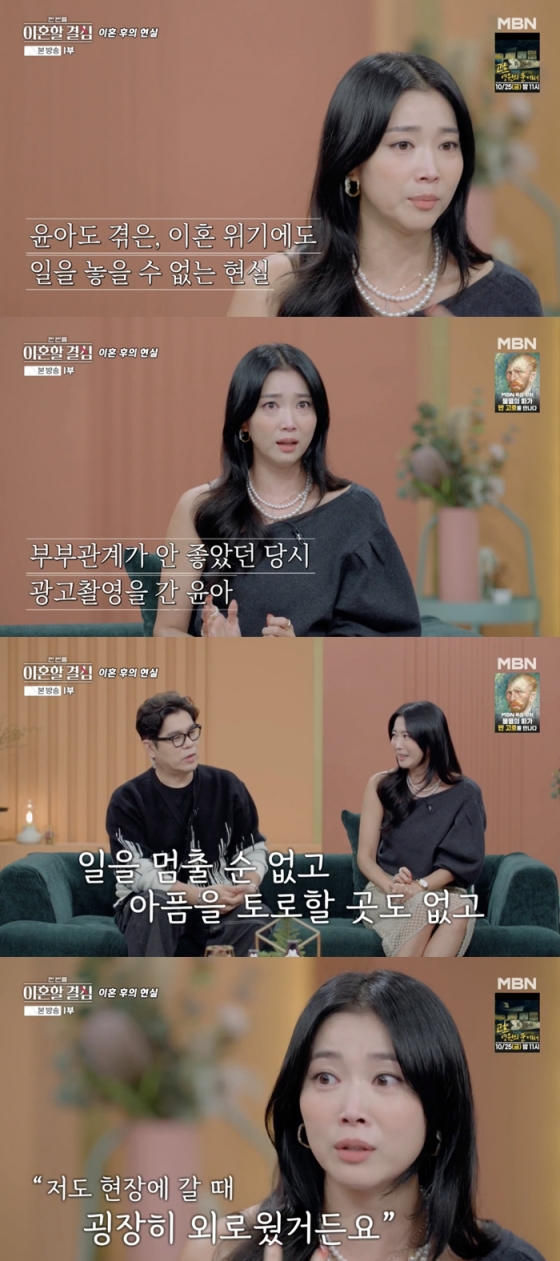 그러면서 "저럴 때는 누군가에게 말하는 게 너무 힘들다. 세상 사람들이 내가 이혼한 걸 아는 상황이 아니라 이걸 어떻게든 감춰야하기 때문에 혼자 부딪혀야하는 무게감이 엄청 컸다"라고 당시 느꼈던 괴로운 감정에 대해 고백했다.