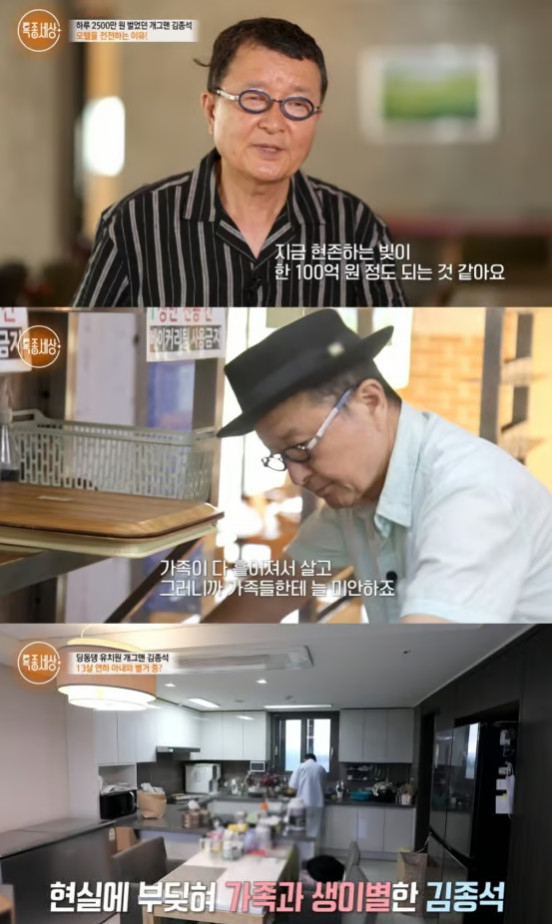 지난 9월 21일 방송된 '특종세상'에서는 100억원대 빚을 진 김종석의 일상이 그려졌다. 그는 "매달 손실이다. 친구들에게 돈 빌린다. 이 상태로 앞으로 1년 가면 난 다 망할 거 같다. 가족이 다 흩어져서 사니까 늘 미안하다. 내가 도저히 감당할 수 없는 형편"이라며 "내가 빚이 100억 원이다. 100억 원에서 한 105억 원 사이 정도 빚"이 있다고 밝혔다.