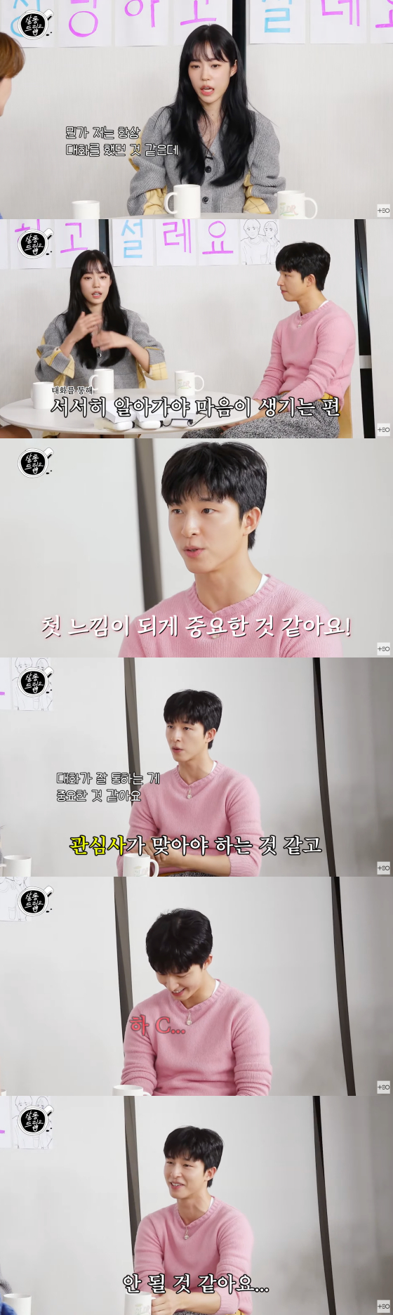노윤서는 "저는 대화를 꼭 하는 것 같다"며 "대화를 하며 천천히 알아가야 하는 편이다. 그리고 허세나 겉멋 없는, 인간적인 모습을 좋아한다"고 답했다.
