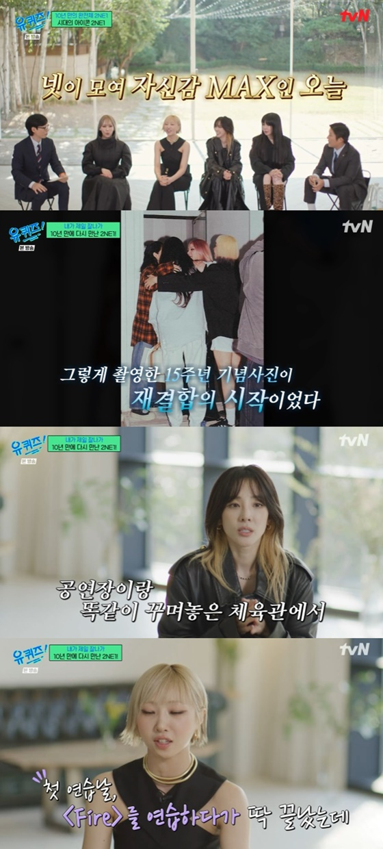 23일 오후 방송된 tvN 예능 '유 퀴즈 온 더 블럭'에는 데뷔 15주년을 맞아 완전체로 돌아온 그룹 투애니원(씨엘, 박봄, 산다라박, 공민지)이 출연했다.