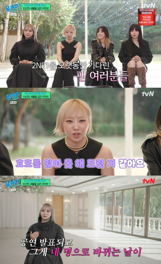 23일 오후 방송된 tvN 예능 '유 퀴즈 온 더 블럭'에는 데뷔 15주년을 맞아 완전체로 돌아온 그룹 투애니원(씨엘, 박봄, 산다라박, 공민지)가 출연했다.