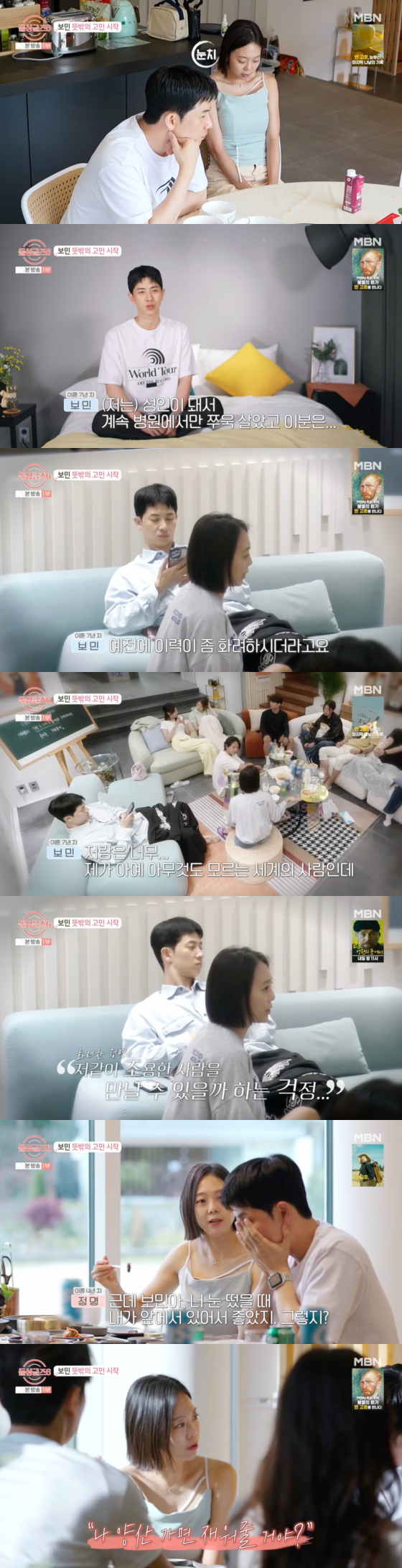 이에 대해 보민은 제작진과 인터뷰에서 "노정명과 서로의 마음이 확인된 건 좋고 고맙다"면서도 "저는 성인이 된 후 병원에서만 살았고 (노정명은) 검색해보니까 이력이 화려하더라. 방송계에서 일을 하신 것 같더라"고 속내를 털어놨다.