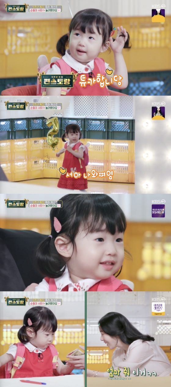 이날 이정현은 '편스토랑' 5주년을 축하하며 "오늘 5주년이라 서아가 인사하면 드리면 좋겠다 싶어서 (녹화장에) 같이 왔다"라고 밝혀 녹화 현장을 술렁이게 했다. 이어 서아는 숫자 '5'가 적힌 풍선을 등에 멘 채 압도적인 귀여움으로 등장했다.