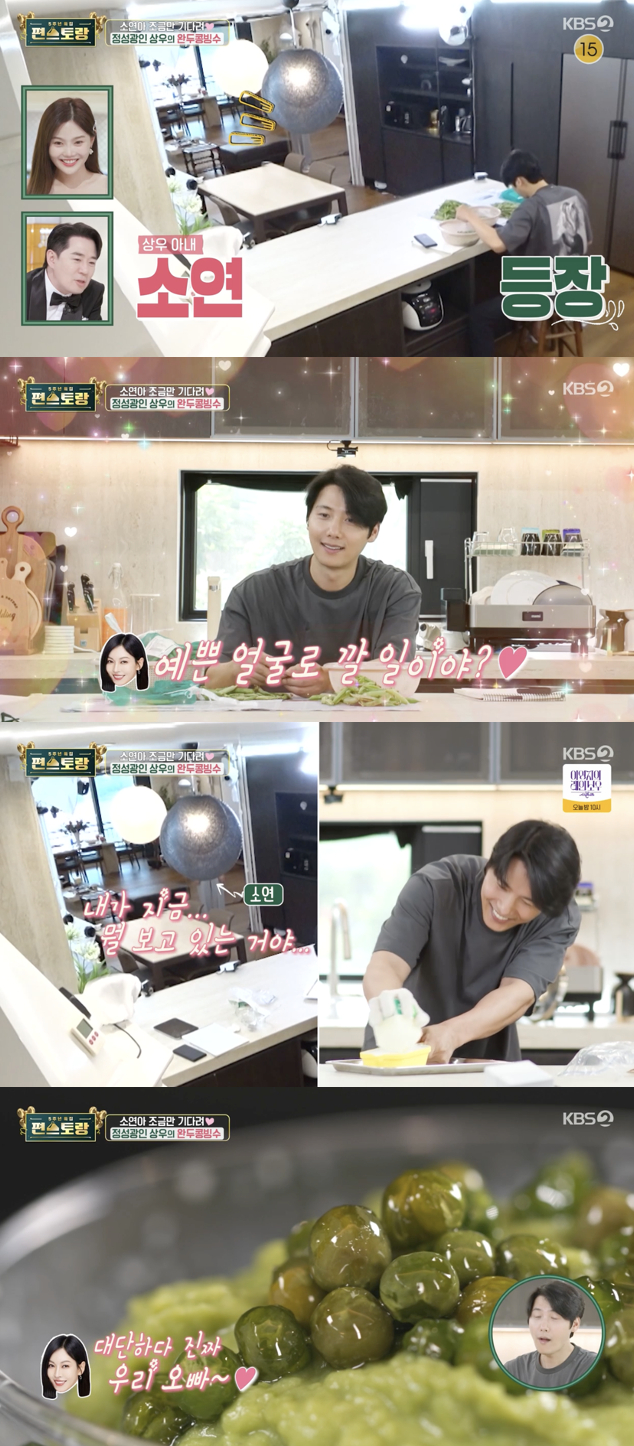 이날 VCR 속에서는 이상우가 완두콩 껍질을 열심히 분리하는 모습이 포착됐다. 이어 그의 아내 김소연이 방에서 대본을 보다가 등장해 "오빠, 뭐해?"라고 다정히 물었다. 이에 이상우는 비비의 '밤양갱'을 개사해 "달고 달고 달디단 '완두양갱'"라고 오늘의 메뉴를 소개해 김소연의 유머를 저격하기도 했다.