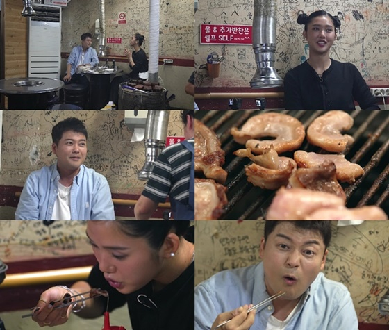 잠시 후, 이곳의 시그니처인 '10가지 종류의 돼지 부속 고기'가 서빙된다. 오소리감투부터 유통까지 처음 보는 신박한 비주얼에 전현무와 미미는 입을 쩍 벌리고, 사장님이 추천한 순서대로 맛을 본다. 특히 미미는 "인생 첫 새끼보(돼지 자궁)!"라며 새끼보를 집어 기대감을 드러내는데, 사장님은 "그건 먹방 난도가 높은 편"이라고 경고(?)한다. 긴장한 전현무는 냄새를 확인하고, "특유의 향이 있다"며 조심스레 입에 넣는다. 직후 그는 미간을 찌푸리더니 기침까지 해 긴장감을 조성한다. 과연 전현무의 솔직한 시식평이 어떠할지 관심이 쏠리는 가운데, 전현무는 "돼지는 성대도 먹어요?"라고 물으며 인생 첫 '성대' 시식에도 도전한다. 직후 그는 아득아득한 식감을 제대로 느끼며 'ASMR 퍼포먼스'까지 선보인다. 미미는 "선배님 치아가 굉장히 건강하신 것 같다"라고 엉뚱 극찬을 퍼붓고, 전현무는 "임플란트 (치아) 아니야~"라며 돌발 해명해 '환장의 먹케미'를 발산한다.