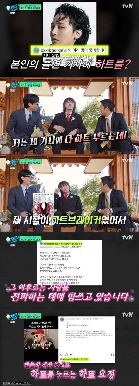 이날 지드래곤은 본인의 출연 기사에 하트를 눌렀다고 고백했다. 그는 "나는 내 기사에 다 하트를 누른다. 내 시작이 '하트브레이커'여서 사랑을 전파하는데 힘쓰고 있다"라고 밝혔다. 실제로 지드래곤은 팬들의 게시글에도 하트를 누르는 것으로 유명하다.