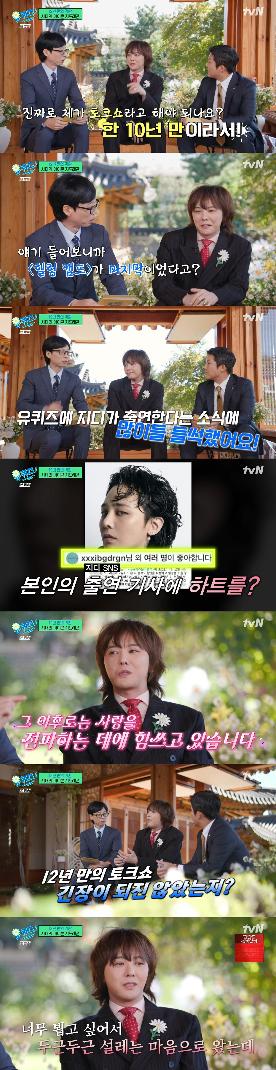 이날 지드래곤은 "이런 토크쇼 출연이 한 10년 만"이라면서 "사실 긴장이라기 보다는 너무 뵙고 싶었다. 오랜만이어서 설레는 마음으로 왔는데 차 내리자마자 굉장히 긴장을 시키시더라. 나도 왜 그런지 모르겠는데 콘셉트가 뭐가 있었나보다. 나도 잘 모르겠었다. 나는 인사를 드리려고 했는데 너무 다들 조용하셨다. 그래서 저 끝까지 나도 조심스럽게 왔다"라며 '유퀴즈' 출연 소감을 밝혔다.