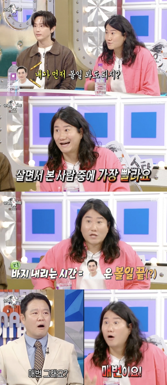 그러면서 "거짓말 안 보태고 살면서 본 사람중 가장 빠르다. '스타킹'에 제보하고 싶을 정도다. 정말 바지 단추를 풀고, 내렸다가 올리면 끝나는 그 시간이다. 매번 그런다. 말도 안 된다"라고 털어놨다.