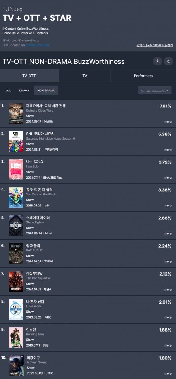 굿데이터코퍼레이션 펀덱스(FUNdex)에서 발표한 10월 4주차 TV-OTT 통합 비드라마 화제성 조사에 따르면 넷플릭스의 '흑백요리사: 요리 계급 전쟁'이 6주 연속 1위에 오른 것으로 나타났다. 특히 해당 프로그램은 화제성을 구성하는 뉴스와 VON(Voice Of Netizen)부문에서 1등 자리를 유지하며, 여전히 네티즌 사이에서 이슈되는 프로그램임을 증명했다. 프로그램 출연자인 안성재는 비드라마 출연자 화제성 2위, 백종원은 5위에 올랐다.
