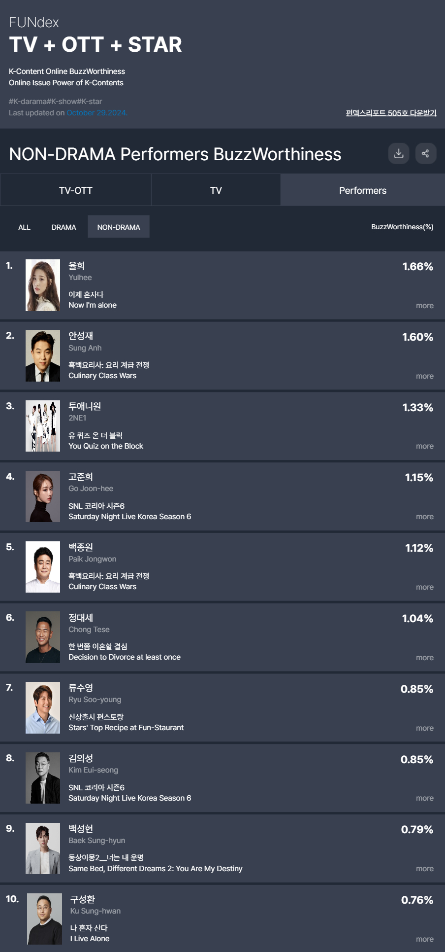 한편, 비드라마 출연자 화제성 1위는 '이제 혼자다'에 출연한 율희인 것으로 나타났다. 해당 프로그램에서 율희의 갑작스러운 이혼 사유가 다뤄지면서 이슈가 되었다.