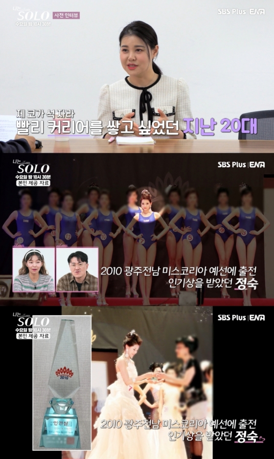 전날 방송된 '나는 솔로'는 23기를 새롭게 시작했다. 이날 정숙은 자신을 '인간 비글'이라 소개하며 2010년 광주·전남 미스코리아 예선에 출전해 인기상을 받았다고 밝혔다. 특히 그는 미스코리아 시절 사진을 공유하며 "내 리즈 시절이다. 이때 남학생들이 다 나만 바라보고 있었다"라고 자랑하기도 했다.