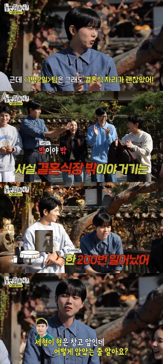 이에 딘딘은 "(양)세찬 형과 (양)세형이 형은 창고 앞이었대"라고 전했고, 유재석은 "문이 하도 (열렸다 닫혀서) 추웠대"라고 말했다. 주우재는 "세형이 형은 창고 앞인데 어떻게 앉았는 줄 아냐. 결혼식장을 등지고 앉았다"라고 했고, 딘딘은 "(유)재석이 형 자리만 명당자리였다"라고 덧붙였다