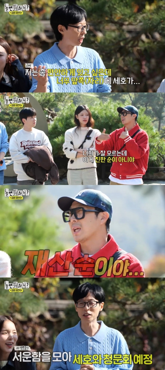 이에 유재석이 "저는 좀 편안하게 앉고 싶은데 너무 앞쪽 (자리)에 세호가 (배정을 해줘서).."라고 했다. 이에 하하는 "너네가 잘 모르는데 좌석 배정이 친한 순서가 아니다. 재산순이다. 그러니 많이 모아라"라고 농담했다.