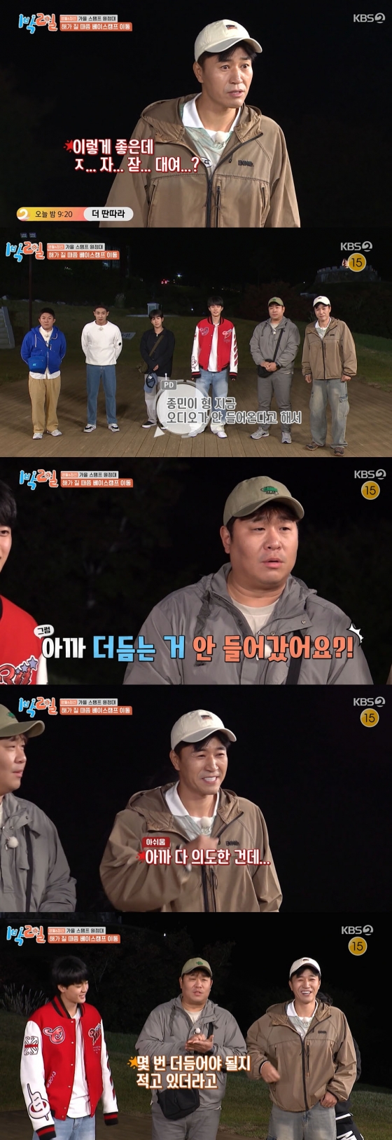 이날 김종민은 오늘 머물게 될 베이스캠프의 웅장함에 "우리가 이렇게 좋은 데서 자도 돼요?"라고 더듬거리며 감탄했다. 그러고 얼마 후 제작진은 김종민에게 "(김) 종민이 형 오디오가 안 들어가서"라며 잠시 촬영을 중단시켰다.