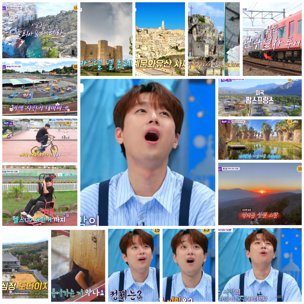 첫 번째 랜선 여행은 '이탈리아의 발꿈치' 풀리아·마테라. 완벽한 8각형 모양으로 만들어진 중세 건축의 정수 카스텔 델 몬테와 협곡을 깎아 만든 마을 마테라의 세계문화유산 사씨(Sassi)가 소개됐다. 산을 깎아 만든 교회에 광장 아래 숨겨진 비밀의 장소가 공개되자 이찬원은 "와~"라며 눈을 크게 뜨며 놀라며 호기심을 유발했다.