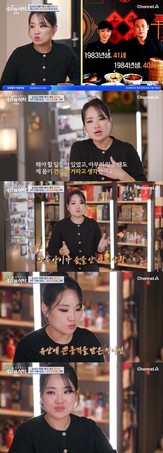 4일 방송된 채널A 예능 프로그램 '4인용 식탁'에서는 여성 중식 셰프 정지선이 출연했다. 그는 어려웠던 시절 힘이 되어준 여경래 셰프, 개그맨 정준하, 가수 별을 초대해 특별한 식탁을 준비했다.