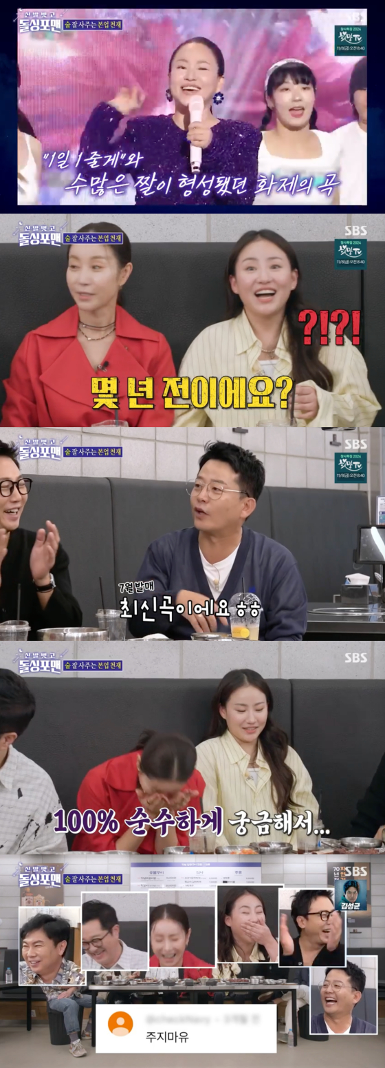 조현아는 최근 화제를 모은 곡 '줄게'도 언급했다. '줄게' 무대를 본 한다감은 돌연 "몇 년 전이냐"고 물었고, 조현아는 "두 달 전"이라고 답해 웃음을 자아냈다.