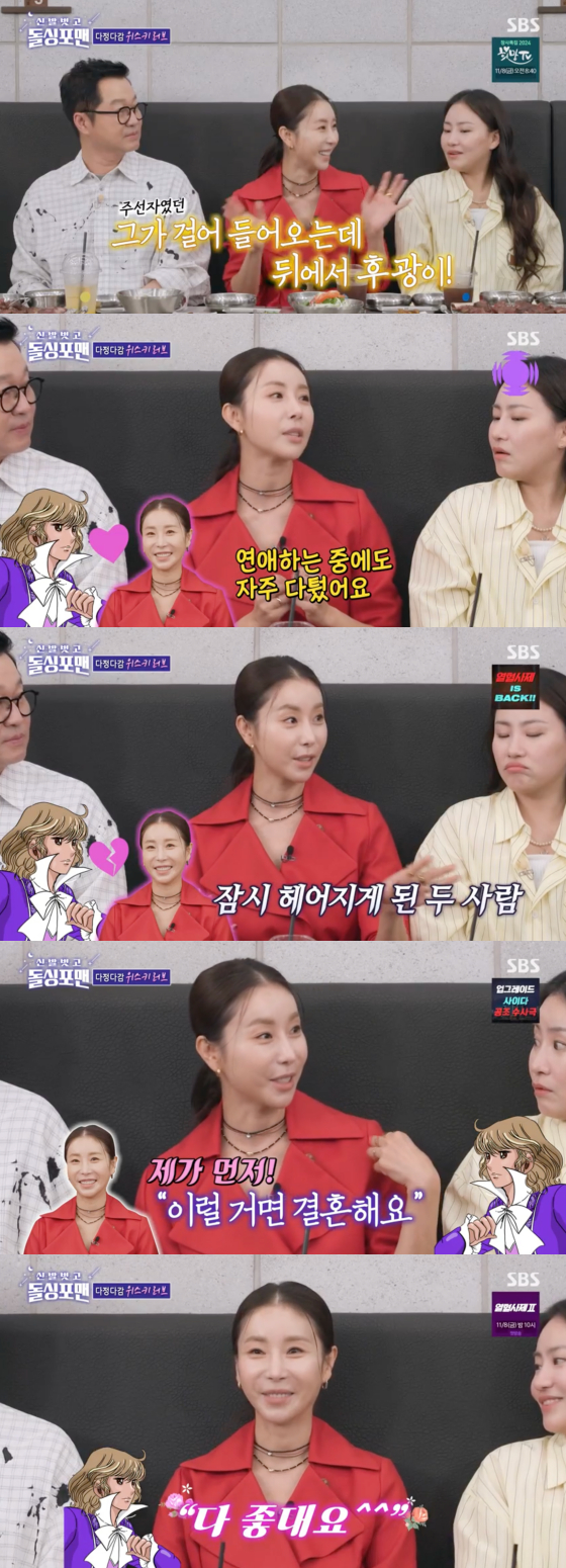 한다감은 "(헤어진 후) 대화를 하려고 다시 만났는데 또 후광이 비추는 거다. 그러니까 헤어지려는 결심이 달라졌다. 제가 먼저 '이럴 거면 차라리 결혼하자'고 했더니 남편이 '응'이라고 답했다"고 프러포즈 일화를 밝혔다.