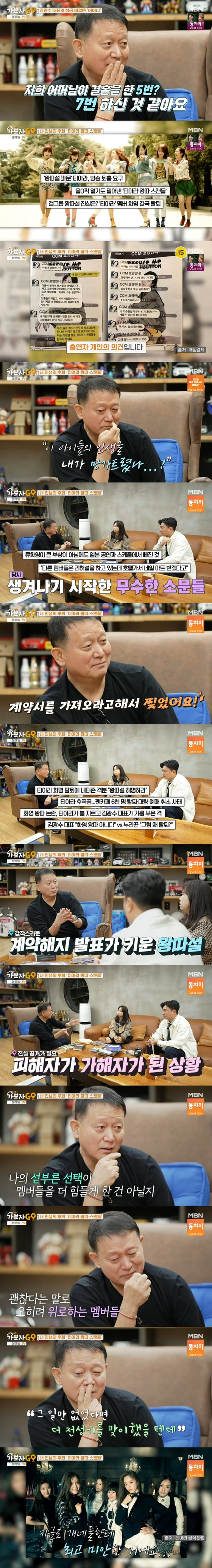 김광수 대표는 "방송에서 처음 얘기하는 건데 화영과 (류)효영 자매한테 계약서를 가져오라고 해서 찢어버렸다. '나가라, 너네 조건 없이 풀어줄 테니까 너네 일해라' 했다. 근데 그게 인터넷상에선 의지가 어떻고 '화영이 왕따가 아니냐' 막 퍼진 거다. 티아라 멤버들의 부모님들이 다 찾아와서 기자회견 하고 카톡 다 공개하자 하셨었다. 근데 제가 어린 친구들이고 '그럼 저 친구들 인생은 어떡하냐' 하며 말렸다. '화영, 효영 인생 어떡해' 하다가 제가 죽은 거다. 제가 생각할 때 티아라는 잘못이 없어서 방송을 강행했다. 그런데 '김광수가 얼마나 힘이 있으면, 얼마나 막강하면 강행하냐' 그렇게 보시더라. 우리 애들은 잘못이 없는데"라고 억울함을 토로했다.