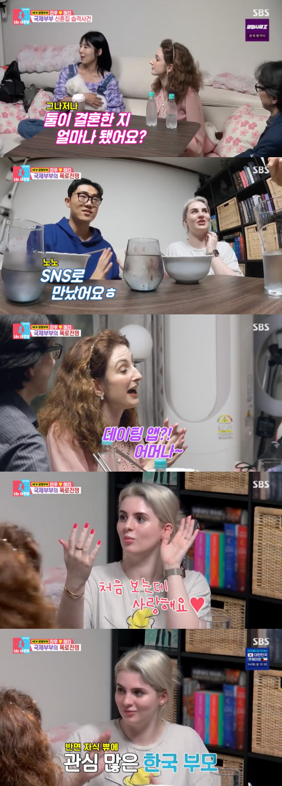 "어떻게 만났냐"는 사유리 질문에 진우는 "인스타그램과 데이팅 앱으로 만났다. 해티가 한국 온 지 2주 만에 첫 만남을 가졌다. 그때 제가 먼저 DM으로 연락을 했다. 제가 '좋아요' 눌렀는데 해티도 '좋아요'를 눌러서 만나게 됐다. 처음 봤을 때 느낌이 왔다"고 답했다.
