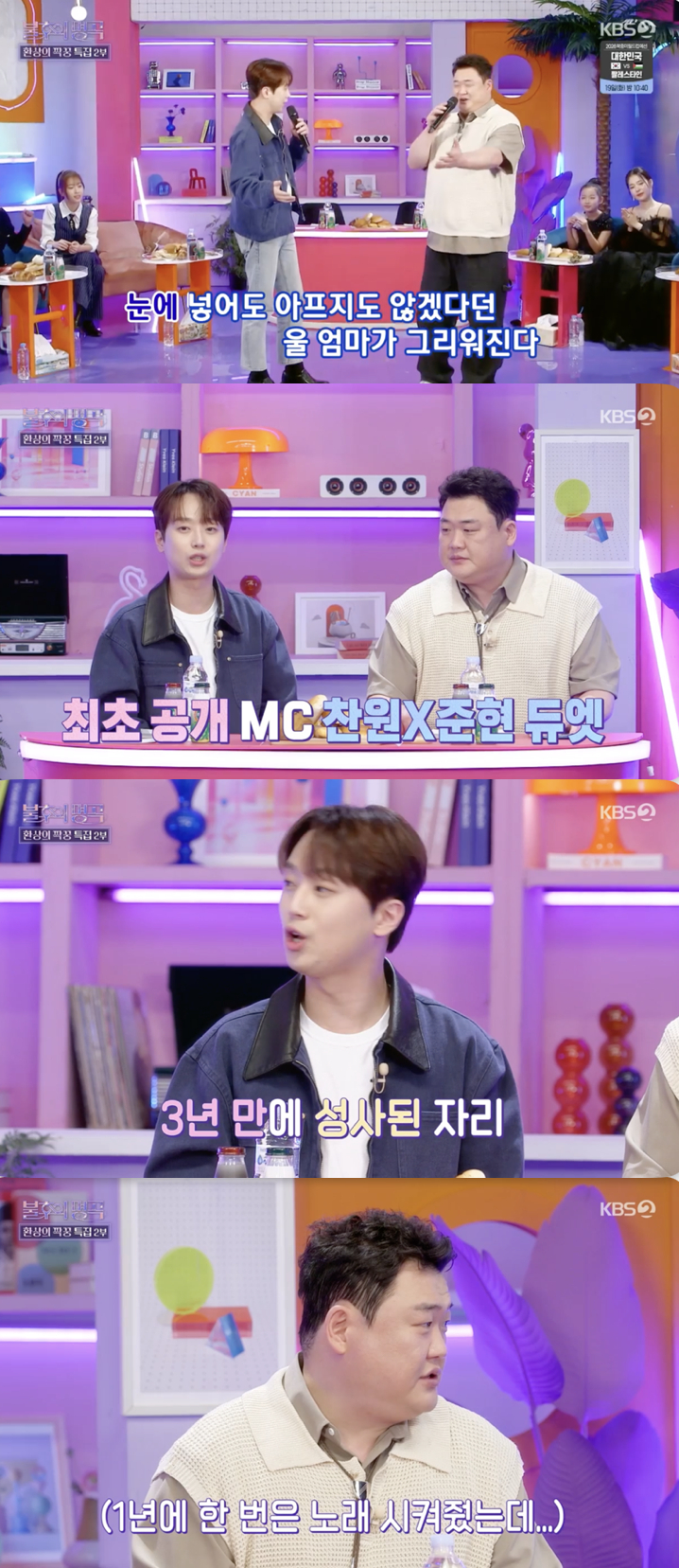 이찬원은 "우리 둘이 MC를 한 게 3년인데 듀엣 무대를 하는 게 역사상 처음이다"라며 감격스러움을 표했다. 김준현은 "원래 '불후의 명곡'에서 1년에 한 번씩 노래를 시켜준다. 그런데 더 이상은 안 된다고 하더라. 정 부르고 싶으면 대기실에서 부르라고 하더라"라며 비화를 털어놔 웃음을 자아냈다.