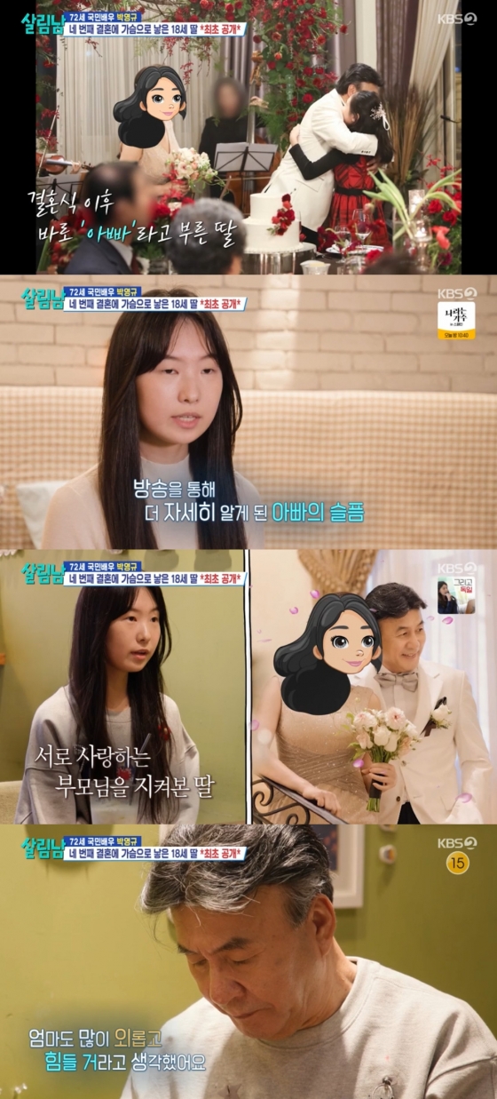 박영규는 딸과 커플티를 입고, 다정하게 거리를 걷는가 하면 네 컷 사진을 찍어 훈훈함을 안겼다. 두 사람은 2019년 처음 만났고, 딸은 박영규와 첫 만남에 대해 "두 분이 차 타고 저를 데리러 왔던 건 기억이 난다. 엄마가 배우랑 재혼한다고 했는데 처음에는 아저씨라고 부르다가 두 분이 너무 좋아하는 모습이 보이니까 결혼식하고 나서 아빠라고 불렀다"라고 했다.