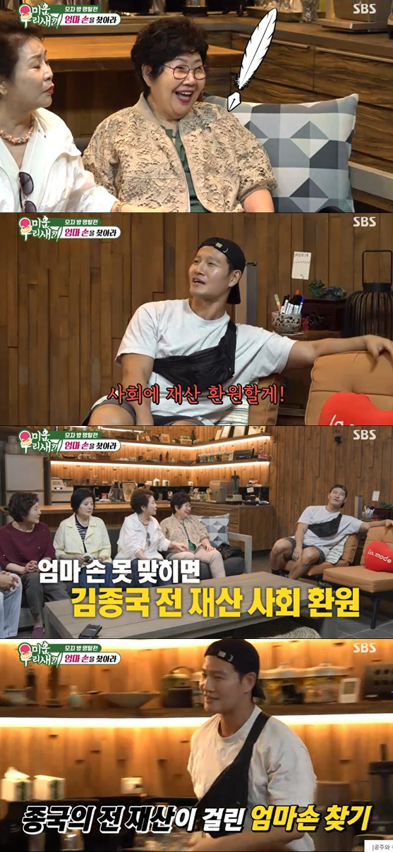 각자 자신의 엄마 손을 확인 할 수 있다고 호언 장담한 가운데 김종국은 "나는 무조건 맞춘다. 틀리면 전재산을 주겠다"라며 "엄마손을 맞추지 못하면 전재산을 사회에 환원하겠다"라고 입장을 밝혔다. 이에 김종국의 엄마는 물론 스튜디오의 아버지까지 긴장한 채 게임을 진행했다.
