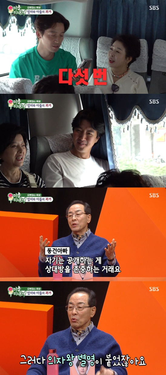 서장훈 역시 "그렇게 많나"라고 놀라자 이동건의 아버지는 "사귀었다 하면 바로 공개를 한다. 그래서 제가 연예인이 왜 공개를 다 하냐고 했다. 다른 사람들은 다 감추는데"라며 "그런데 우리 아들은 공개하는게 상대방을 존중하는거라고 하더라. 그래서 의자왕이라는 별명이 붙었다. 솔직하게 공개했는데 왜 의자왕이냐고 하더라"라고 아들을 셀프 디스해 웃음을 자아냈다.