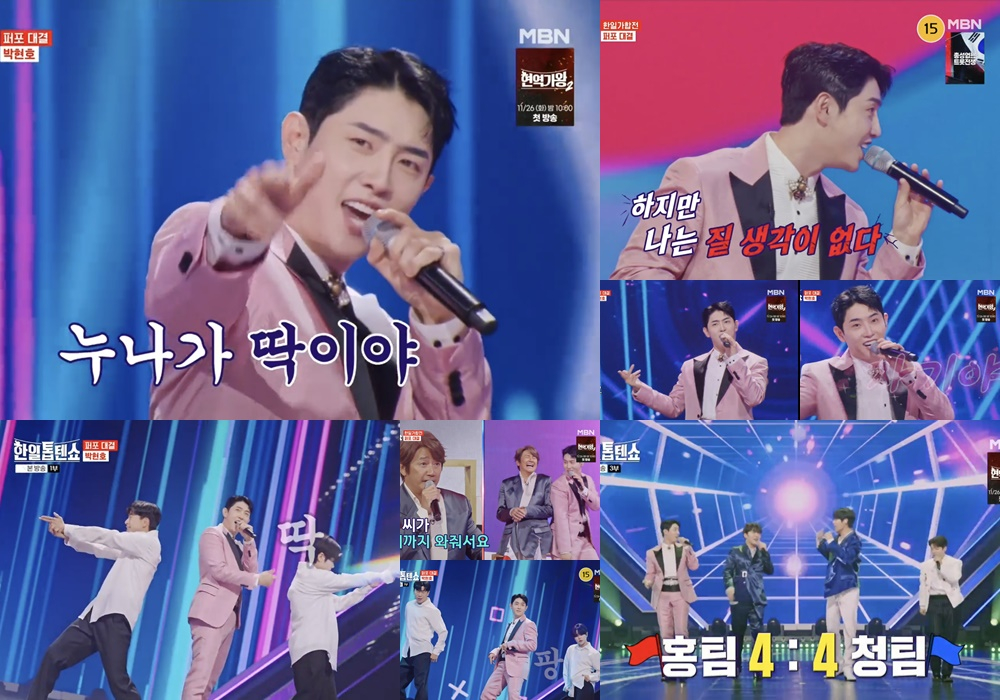 박현호는 지난 18일 '한일톱텐쇼'에 오랜만에 출연해 명실상부 '퍼포먼스 장인'다운 이름값을 톡톡히 해냈다. 박현호가 출연한 '한일톱텐쇼' 26회는 일본 '홍백가합전'을 모티브로 한 한일 가요제 '한일가합전' 특집으로 진행됐고, 박현호는 남자팀인 청팀의 일원으로 출격해 막강한 존재감을 뿜어냈다.