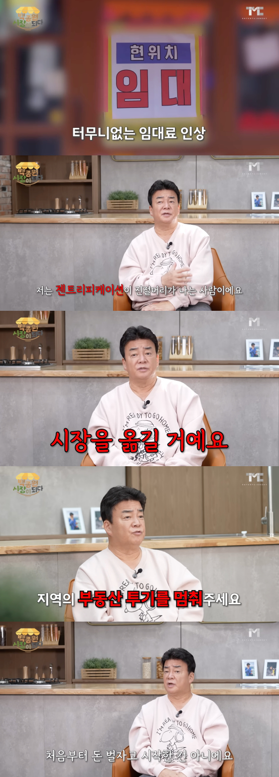 백종원은 "나는 젠트리피케이션이 진절머리가 나는 사람이다. 진절머리"라고 강조했다. 젠트리피케이션이란 낙후된 구도심 지역이 활성화되어 중산층 이상의 계층이 유입됨으로써 원주민을 대체하는 현상을 뜻한다.