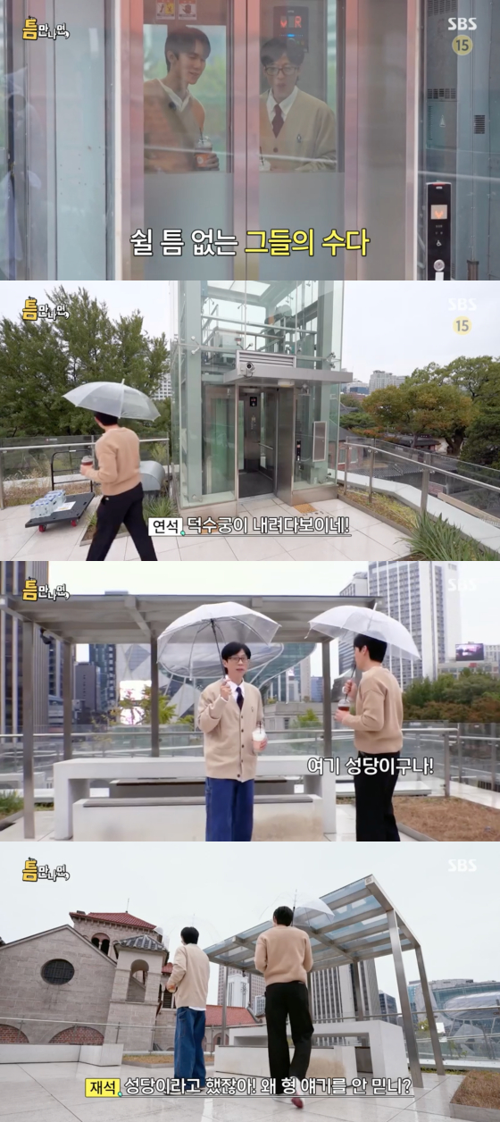 이후 두 사람은 덕수궁이 한눈에 보이는 성당 앞에 자리했다. 유연석은 "여기가 성당이구나"라고 감탄했고, 유재석은 "내가 걸어올 때 말하지 않았냐. 왜 내 얘기를 안 믿냐"고 서운함을 토로해 웃음을 안겼다.