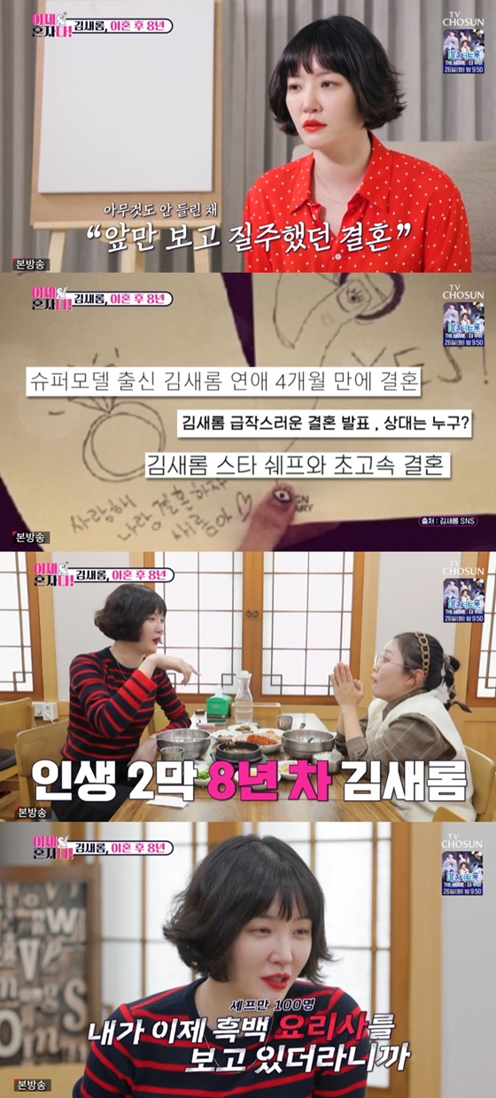 이날 김새롬은 "뭐에 씐 듯이 교통사고처럼 결혼하게 됐다"며 "결혼에 대한 조언을 안 들어서 실패한 타입 같다. 모두가 말렸다. '너무 짧고 더 봐야 하지 않겠느냐', '평생 함께할 사람인데 신중하게 생각해라'라고 모든 사람이 말했는데 경주마처럼 양옆도 안 보이고 귀도 닫혀 있었다. 브레이크가 없는 차 같았다. 속도가 너무 빨리 나는"이라고 밝혔다.