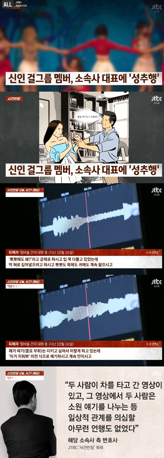 22일 방송된 JTBC 시사교양 프로그램 '사건반장'에서는 걸그룹 멤버를 성추행했다는 소속사 대표 A씨에 대한 제보를 다뤘다.