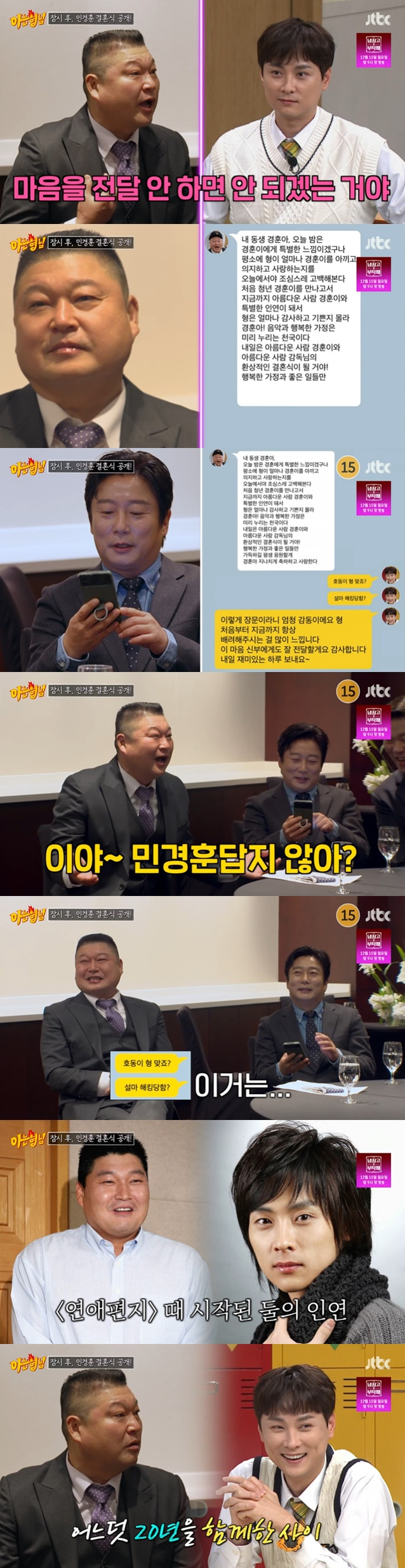 민경훈은 이어 "이렇게 장문이라니 엄청 감동이에요 형. 이 마음 신부에게도 잘 전달할게요 감사합니다"라고 덧붙여 훈훈함을 전했다. 강호동은 "예전에 '연애편지' 할 때부터 지금까지 (인연이) 쭉 이어진 거다"라고 감회를 밝혔다.