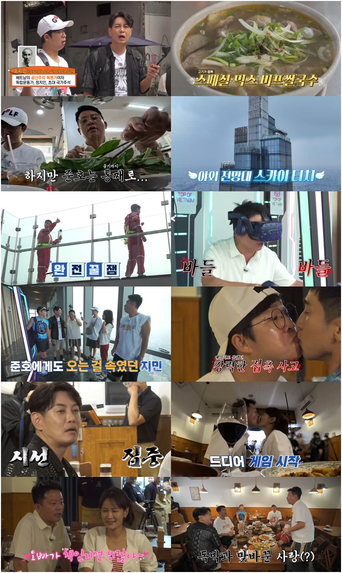 설레는 마음을 안고 베트남의 마천루에 도착한 '독박즈'는 전망대가 위치한 81층으로 올라갔다. 이곳에서 호찌민 시내 절경을 파노라마 스카이 뷰로 즐긴 '독박즈'는 감탄을 연발했고, '고소공포증'이 있는 김준호만 야외 전망대를 직접 걷는 체험을 거부한 채 홀로 VR로 가상 스카이 뷰를 체험했다. VR 헤드셋을 낀 김준호는 가상임에도 "어우, 안 돼!"라며 벌벌 떨었다. 이때 김지민과 유세윤이 몰래 등장해 김준호를 놀라게 했다. 갑자기 등장한 김지민을 보자 다리에 힘이 풀린 김준호는 털썩 주저앉은 채 "이게 무슨 일이야?"라며 '영혼 탈곡' 표정을 지었다. 김지민은 "진짜 정 떨어진다"며 겁에 질린 김준호에게 '팩폭'했고, "(김준호의) 리액션이 별로 안 좋아서 실망했다"고 토로했다. 이에 김준호는 "다시 할게!"라고 외친 뒤, 김지민을 처음 만난 것처럼 연기(?)하며 "지민아 사랑해"라고 고백했다. 나아가 다정히 포옹해 달달한 멜로 분위기를 풍겼다.