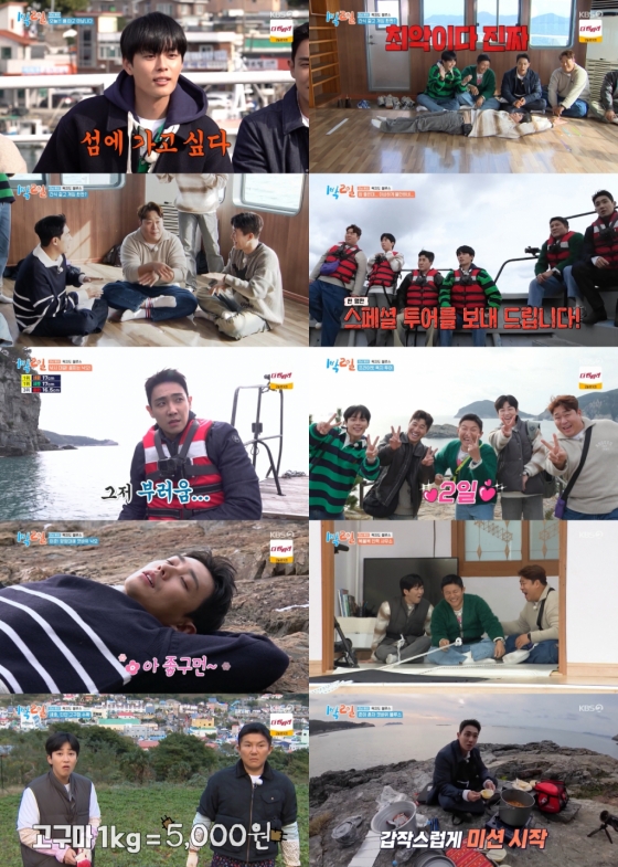 이날 방송에서는 경남 통영 욕지도로 여행을 떠난 여섯 멤버의 첫 번째 이야기가 그려졌다. 욕지도로 향하는 크루즈에 탑승한 '1박 2일' 팀은 눈앞에 펼쳐진 아름다운 풍경에 감탄을 연발했다. 여기에 맏형 김종민이 제작진으로부터 50만 원의 여행 경비까지 얻어내자, 멤버들의 얼굴은 함박웃음으로 가득 찼다.