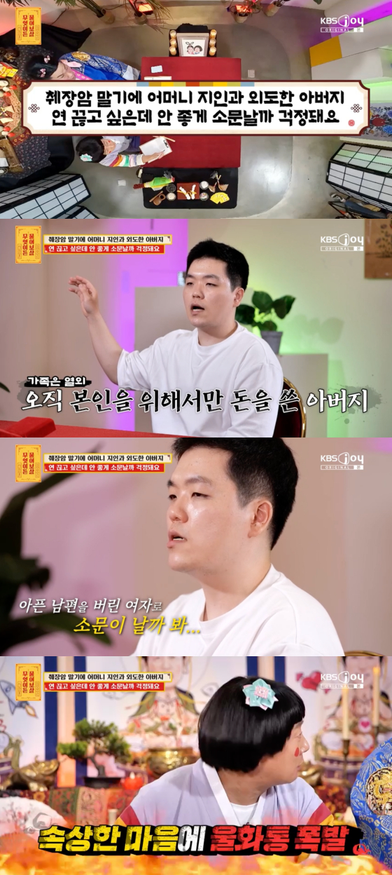 이날 사연자는 "췌장암 말기인 아버지가 어머니 지인과 바람이 났다. 어머니는 연을 끊고 싶지만 아픈 아버지를 버린 사람으로 낙인 찍힐까 봐 그 후폭풍이 걱정된다"고 말문을 열었다.