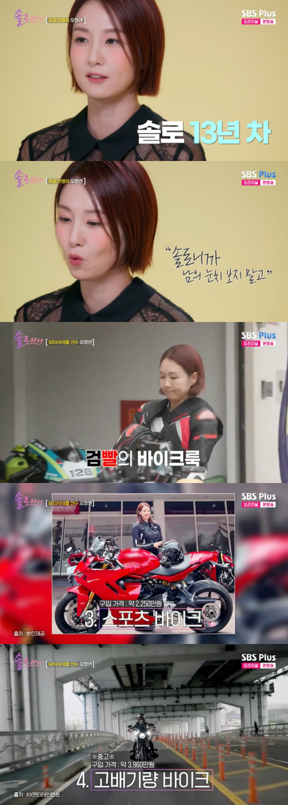 26일 방송된 SBS플러스, E채널 예능 프로그램 '솔로라서'에서는 이혼 13년 차 오정연이 모터사이클 선수로 살아가는 일상을 공개했다.