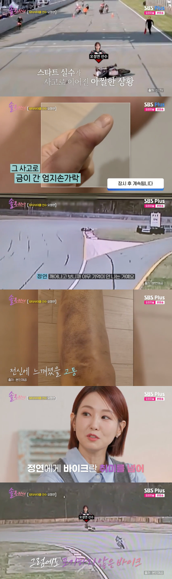 오정연은 "기절했다가 일어났을 때 '나는 누구고 여기서 뭐하는 거지' 싶었다. 그때는 좀 무서워서 눈물도 나고 그랬는데 정신을 차려 보니까 몸이 멀쩡해서 감사했다. 그 사고로 경험이 생겼다. 바이크는 선수로서의 책임감도 있기 때문에 그냥 내려 놓는다는 건 생각하지 않았다"고 말했다.
