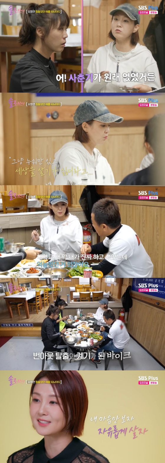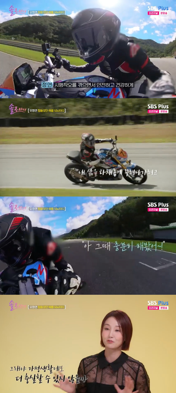 26일 방송된 SBS플러스, E채널 예능 프로그램 '솔로라서'에서는 지난 4월 모터사이클 프로 선수로 데뷔한 오정연이 동료들과 속내를 터놓는 모습이 그려졌다.