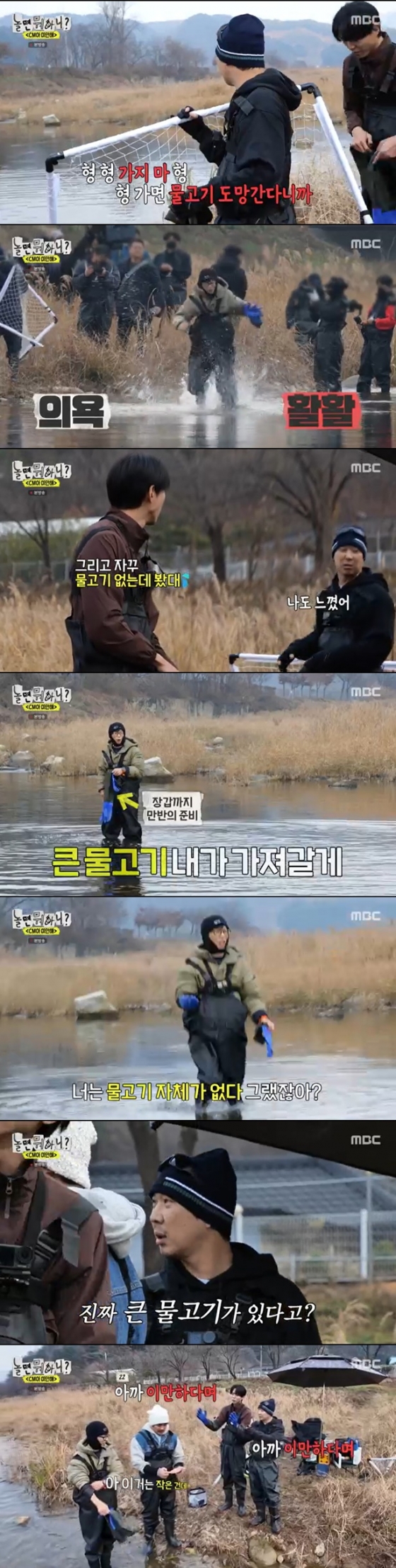 30일 오후 방송되 MBC 예능프로그램 '놀면 뭐하니?'에서는 '토시 어부' KCM과 '어부 4총사'를 결성하는 유재석, 하하, 주우재의 모습이 그려졌다. 네 사람은 일명 '골대낚시'를 시도, 축구 골대로 물고기 잡기에 도전했다.