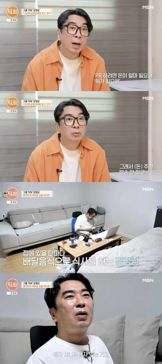 김정남은 10년째 공황장애 약을 복용 중이라고. 그는 "아침, 점심, 저녁으로 먹던 건데 지금은 저녁만 먹었다. 완치가 안 되더라. 명치 부근에 돌덩이 하나가 들어가 있는 것 같다"고 말했다.