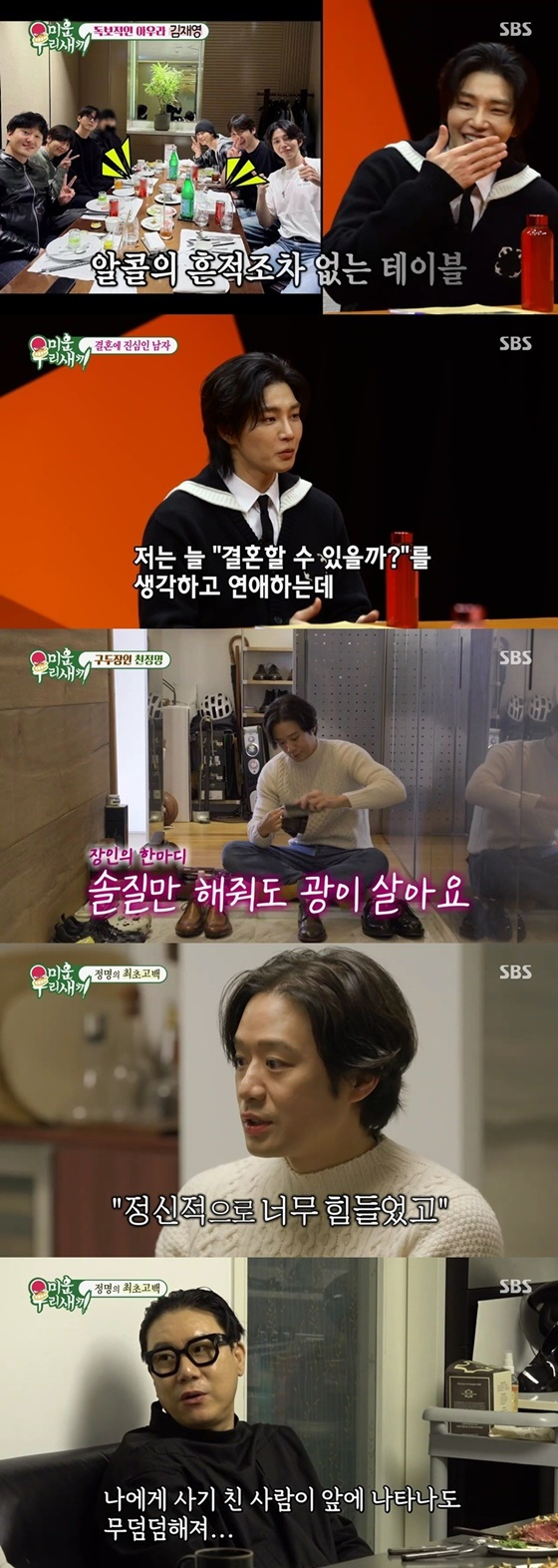 '결혼이 인생의 목표'라는 김재영은 "늘 '이 사람과 결혼할 수 있을까'를 생각하고 연애를 시작하는데 내가 특이하다고 하더라"라고 밝혔고, 신동엽은 "그럼 헤어질 때마다 이혼하는 게 아니냐. (서) 장훈이보다 한참 선배다"라고 받아쳤다.