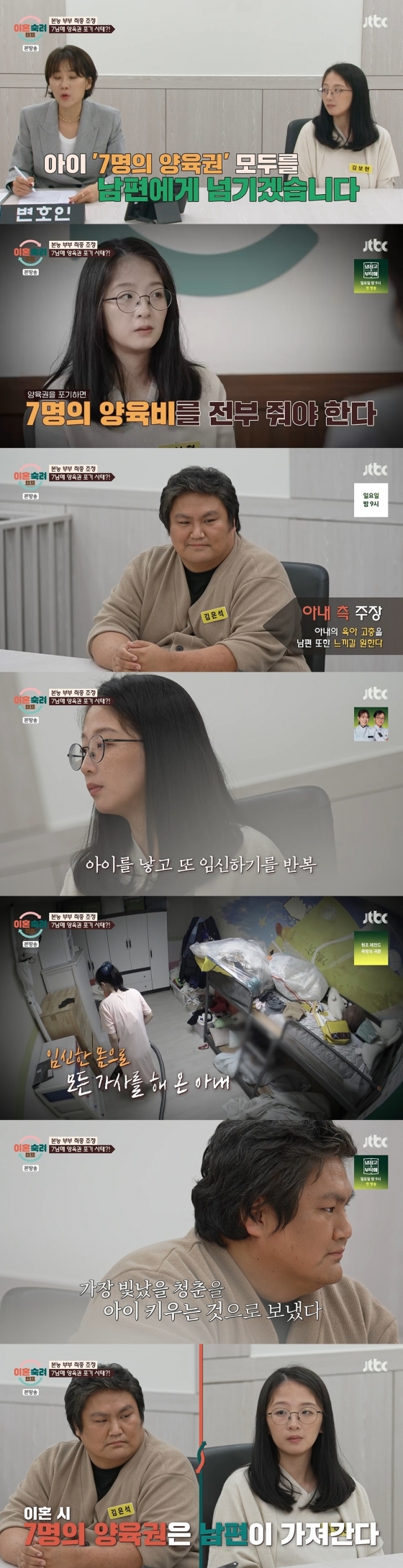 하지만 아내가 "아이 7명의 양육권 모두를 남편에게 넘기겠다"라고 하자 남편은 당황했다. 아내 측은 "여섯 명의 출산으로 몸이 약해졌다. 아이 여섯을 혼자 거의 전담해서 키워서 이혼하게 된다면 아내는 남편에게 아이를 다 넘기고 열심히 경제 활동을 시작해서 양육비를 지급하는 방향으로 생각하고 있다"라고 말했다. 또한 아내는 내년 1월 말에 출산 예정인 뱃속의 일곱째까지도 태어나면 남편 쪽으로 보내겠다고 덧붙였다.