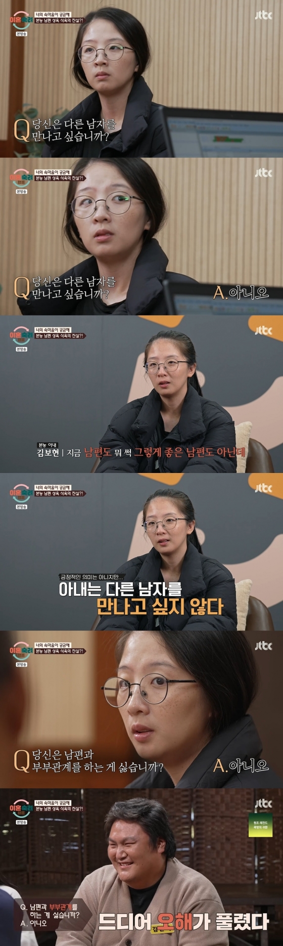 마지막 질문은 성관계 관련이었다. 아내는 '당신은 남편과 부부 관계를 하는 게 싫습니까?'라는 물음에 "아니다. 싫진 않다"라고 털어놨다. 그러자 남편은 "오해 아닌 오해를 하고 있었나 싶다"라며 아내와의 오해를 풀었고, 아내는 "본인 혼자 오해하고 왜 나한테 짜증 냈는지"라며 투덜거렸다.