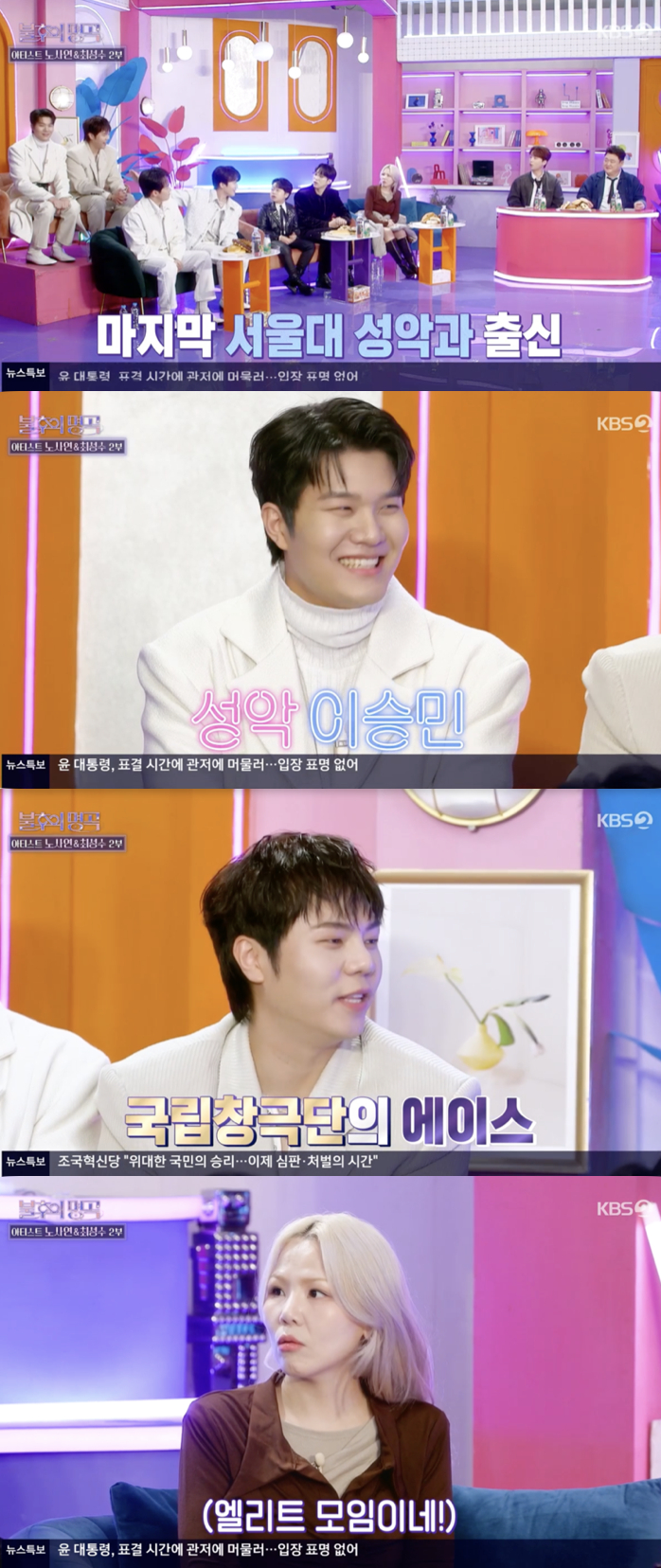 마지막으로 조진호는 성악 담당 이승민을 가리키며 "서울대학교 출신!"이라고 강조해 멤버들의 엘리트함에 자부심을 드러냈다.