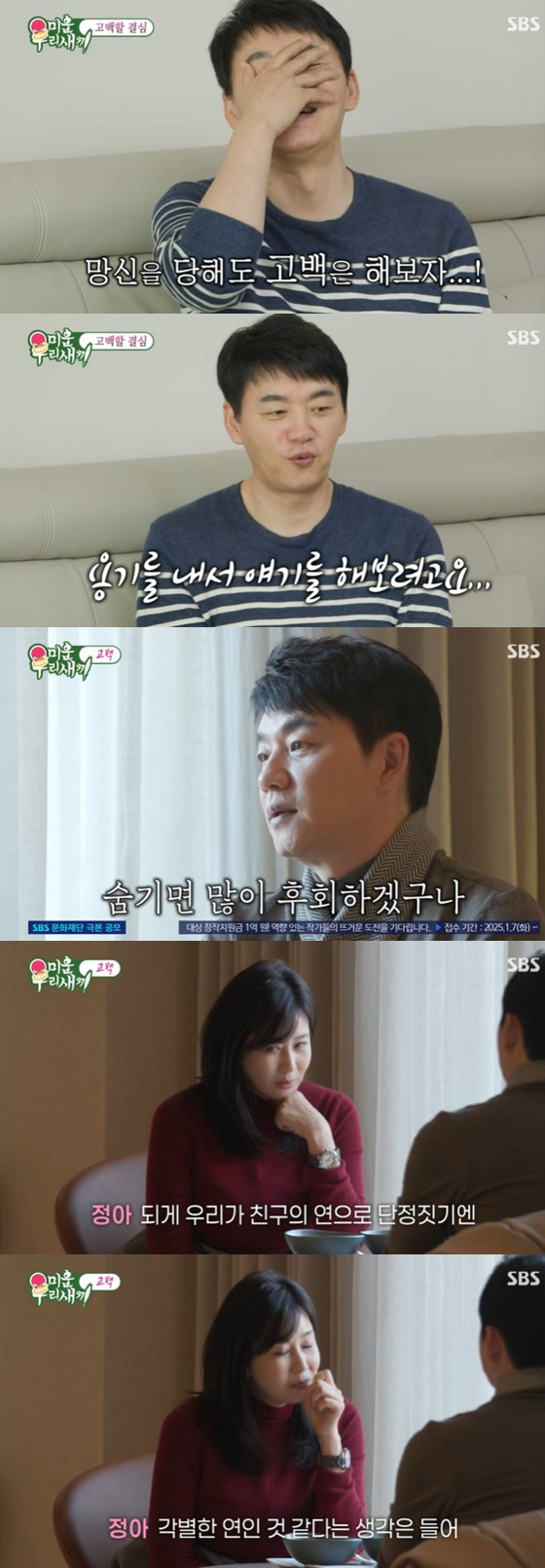 그는 "결론은 친구로서의 감정은 아니라는 거지?"라는 손지창의 물음에 "그렇기 때문에 한 번은 용기를 내서 얘기를 해보려 한다. 솔직히 말하는 용기만큼 겁난다. 정아는 어떻게 보면 남자들보다도 더 오래 볼 친구라는 생각이 들어서"라고 터놓았다.