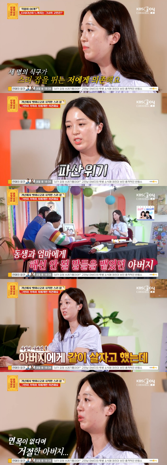 16일 방송된 KBS Joy 예능 프로그램 '무엇이든 물어보살'에는 어릴 적 가난에서 벗어나기 위해 쓰리잡을 하고 있다는 사연자가 출연했다.