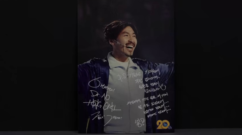 영상에서는 유재석 박명수 정준하 하하 노홍철 정형돈 전진 조세호 양세형 등 멤버들의 '무한도전' 20주년 축하 친필 메시지가 공개됐다.