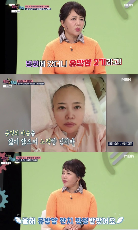 지난 17일 MBN 시사교양 프로그램 '한번 더 체크타임'에서는 배우 김희라가 게스트로 출연해 유방암 2기 판정 후 완치까지의 힘들었던 과정을 고백했다.